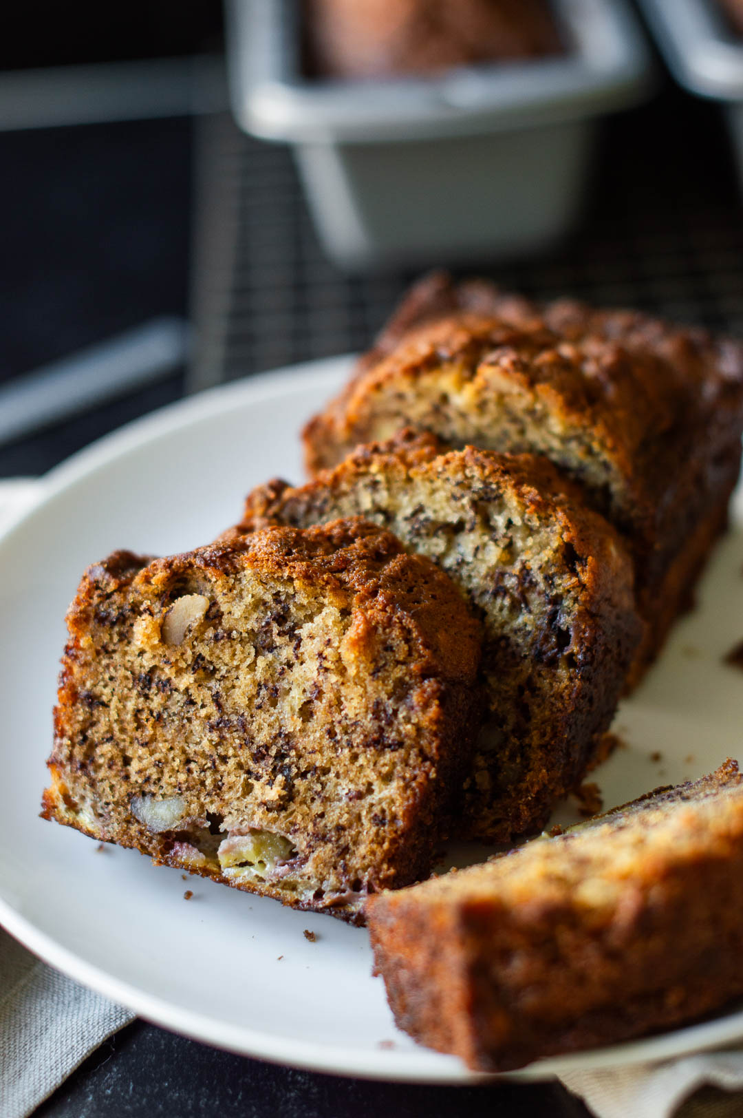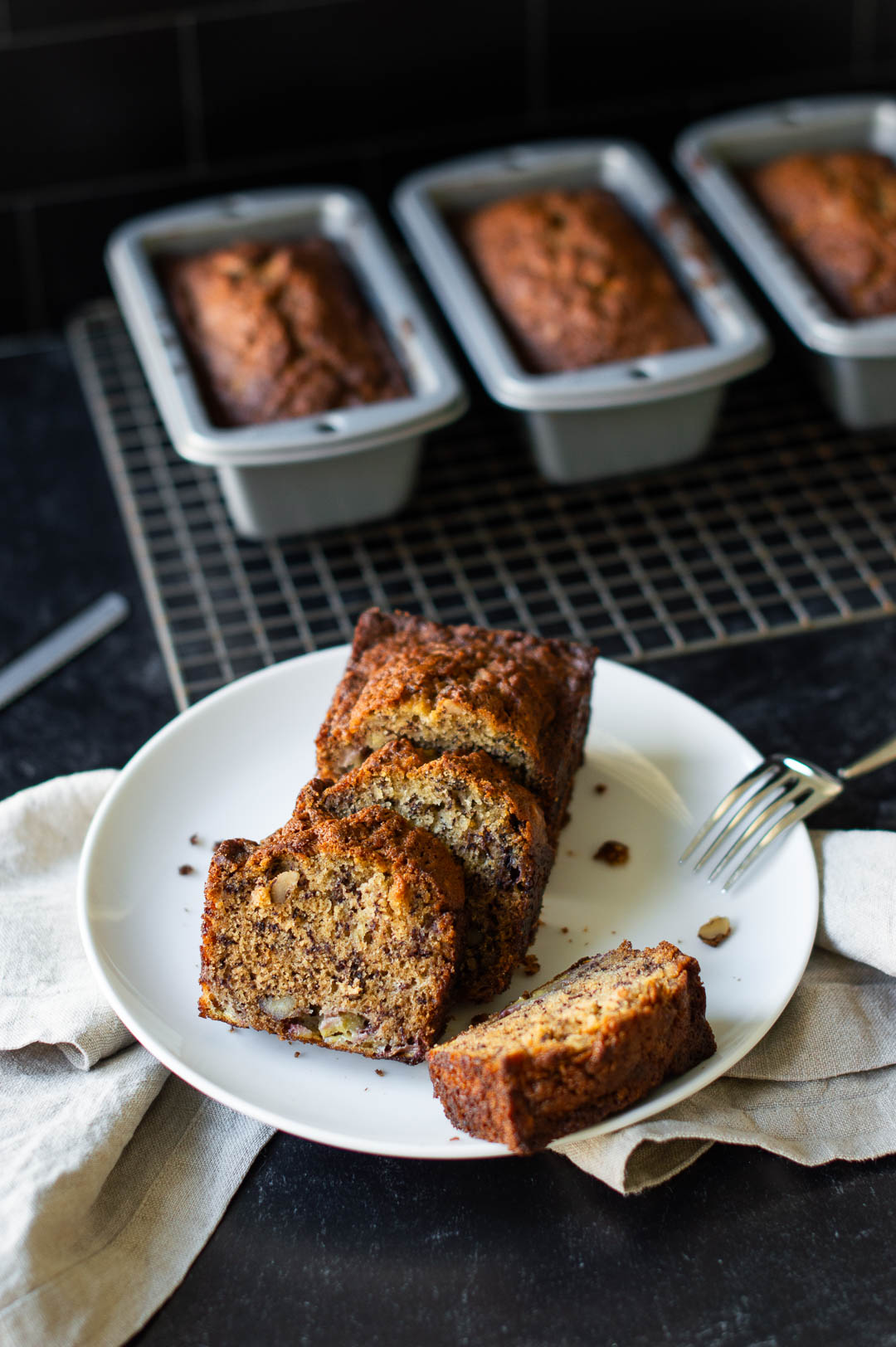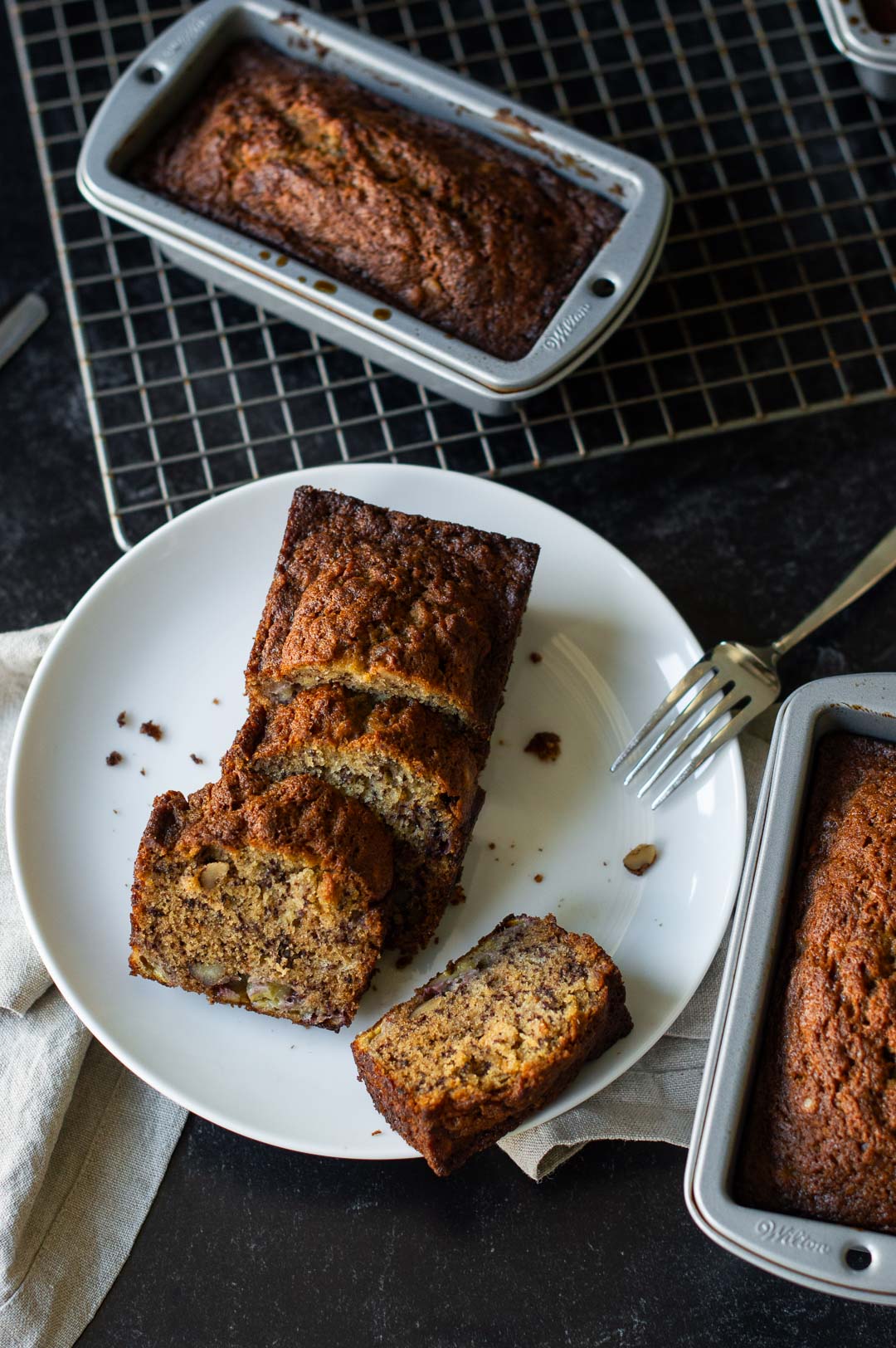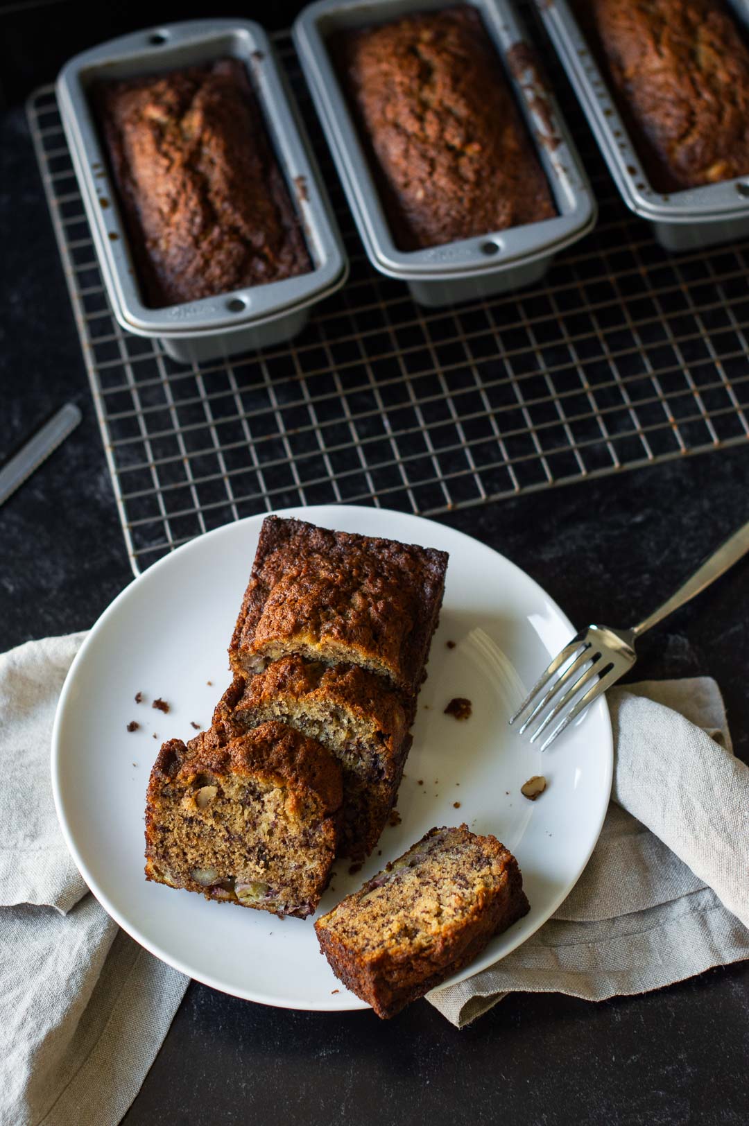 This recipe uses pantry staples and a generous amount of bananas, because banana bread should actually taste like bananas and it amps up the moisture 10-fold. I recommend four bananas but have used six.