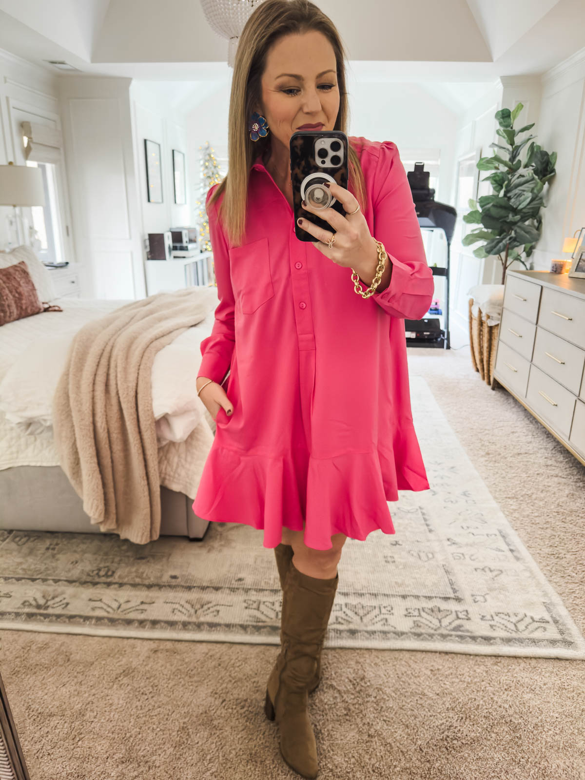 Tuckernuck Pink Shirt Dress ($30 w/ code SHOWTIME; originally $148) | Boots (50% off) | Earrings (30% off) | Chain Link Bracelet (70% off) | Pearl Bow Ring (72% off & just $9.50!)