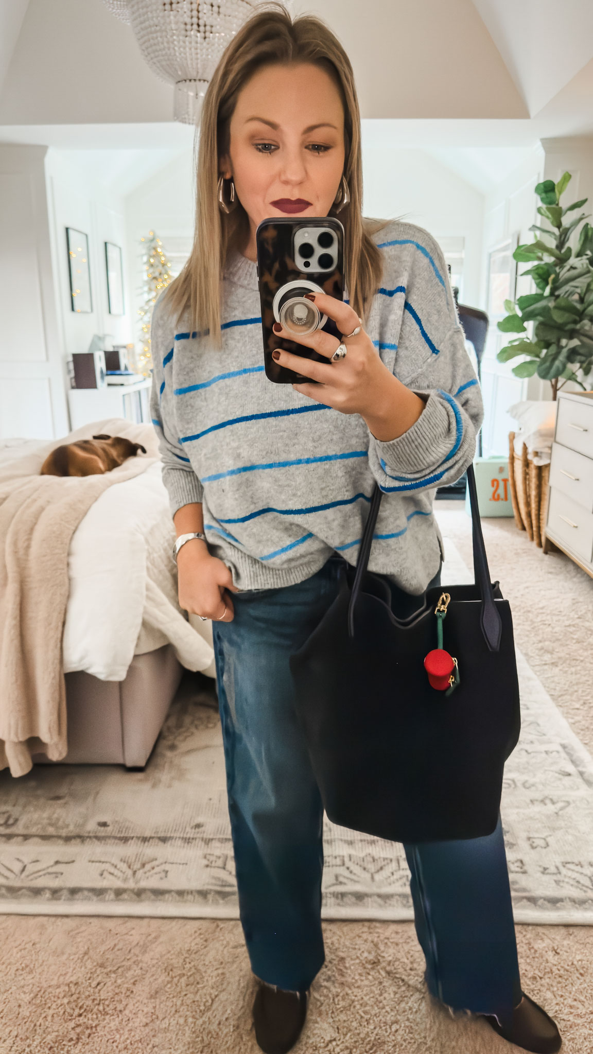 Sweater (47% OFF) | Stovepipe Jeans (40% OFF) | Loafers (40% off) | Shopper Tote (40% OFF) | Earrings (40% OFF) | Cherry Purse Charm (25% OFF) | Silver Statement Ring (30% OFF) | Silver Bracelet (40% OFF)