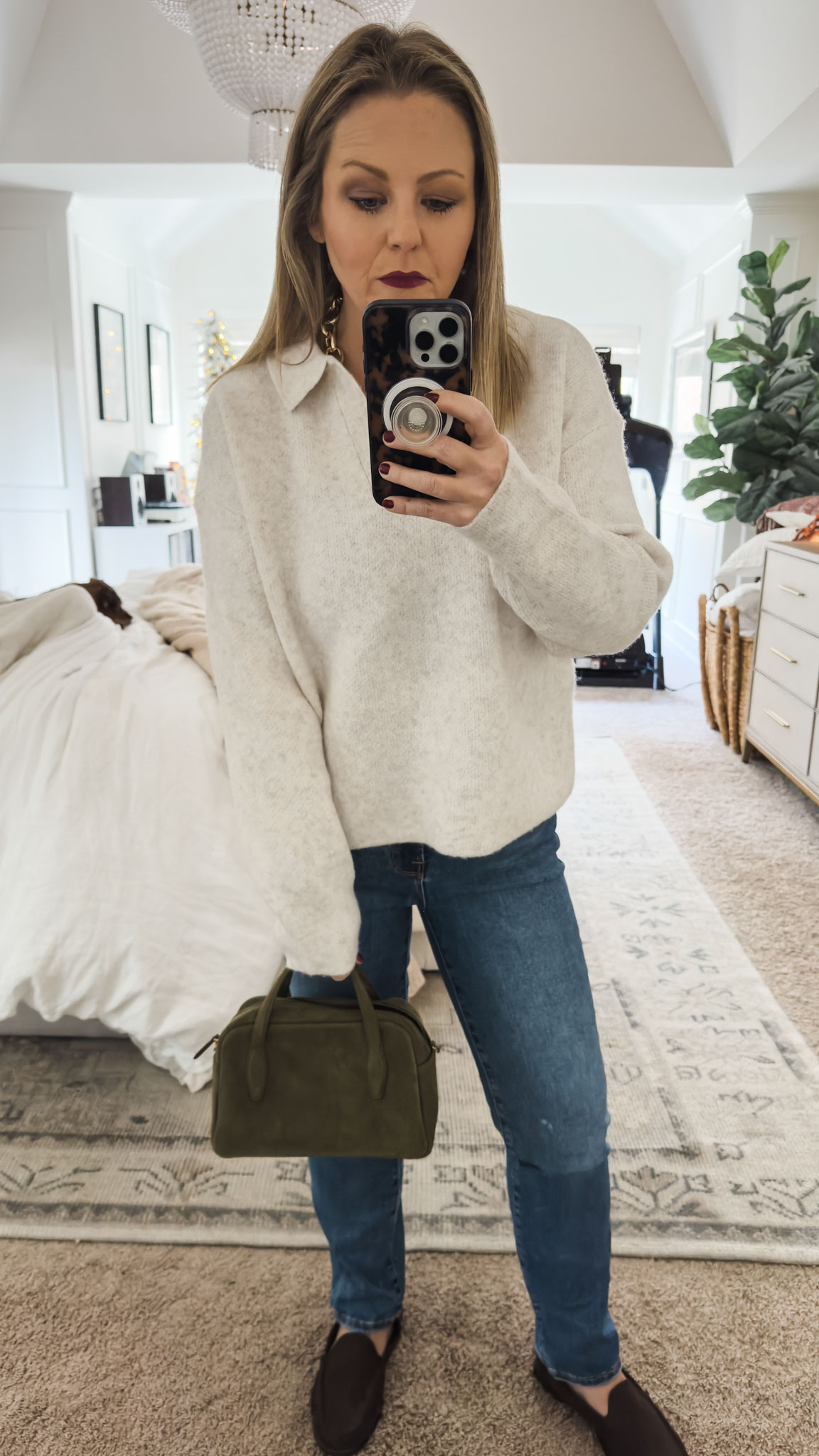 Polo Sweater (40% OFF)| Jeans (40% OFF) | Chain Necklace (40% OFF) | Loafers (40% OFF) | Suede Bag (67% OFF)