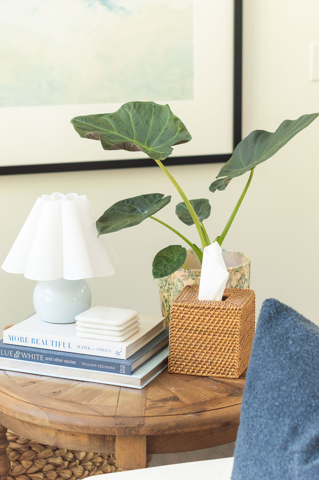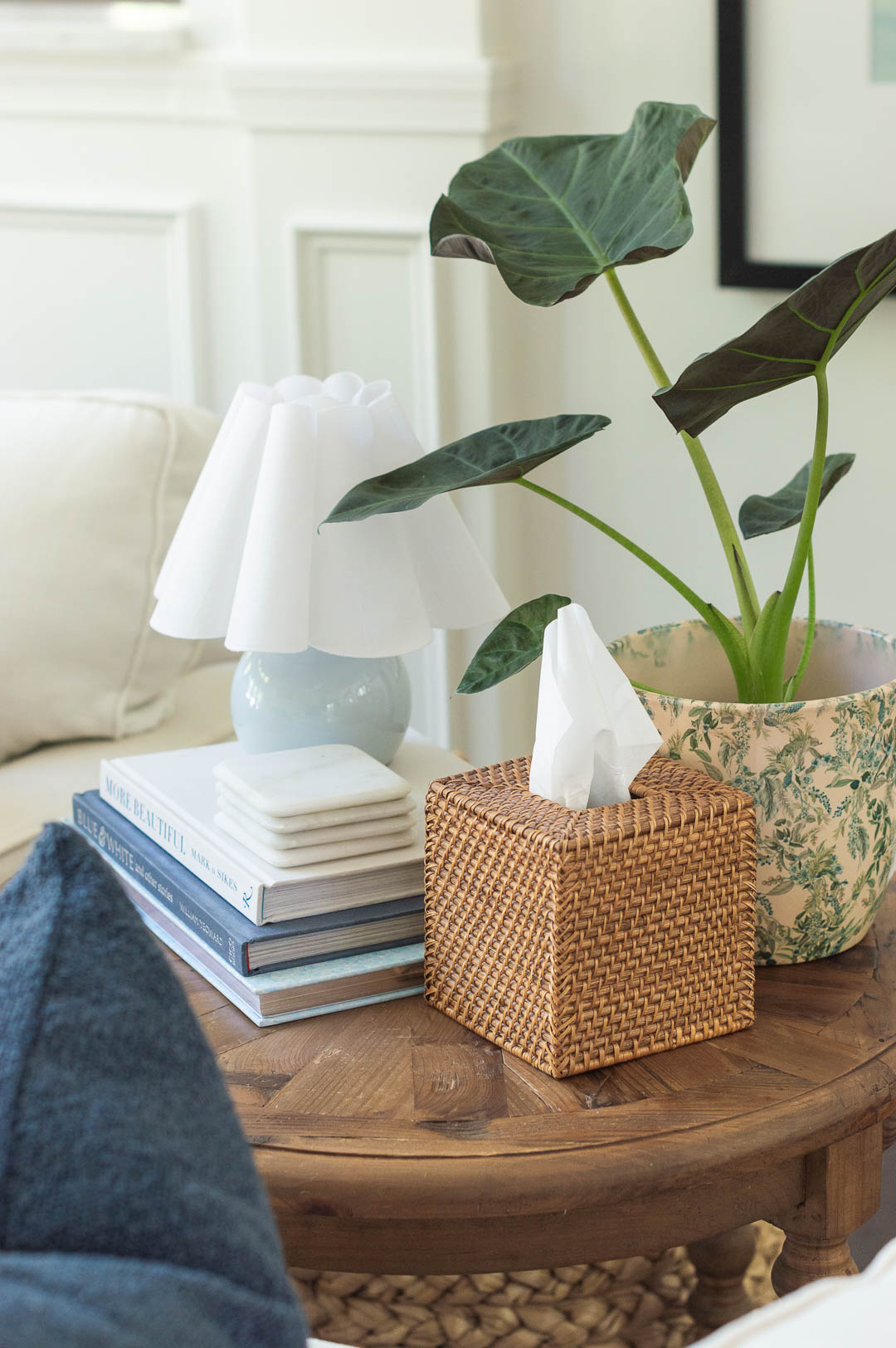 Lamp | Rattan Tissue Holder | Navy Blue Boucle Throw Pillow Cover (set of 2) | Coasters (SIMILAR) | More Beautiful Book | Blue & White and Other Stories Book | Escape Book | Table