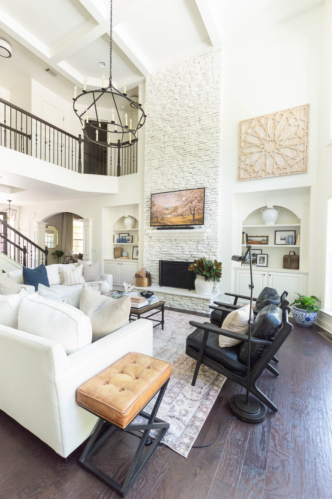 Navy Blue Boucle Throw Pillow Cover (set of 2) | Gold Beverage Tub | Area Rug | White Stoneware Vase | Striped Throw Pillow | Iron Chandelier | Wood Wall Art | Sofa | Tufted Leather Stool | Faux Magnolia Stems | White Stoneware Vase | Terracotta Vase | Black Leather Armchairs | Coffee Table | Linen Pillows | Floor Planter (similar) | Asian Ginger Jar | Vase | Rattan Tray | Coral (similar) | Black Teak Bowl | Jade Bead Garland (similar) | Blue & White Done Right | Sophisticated Simplicity | Audubon Bird Book