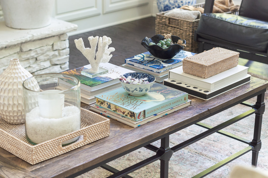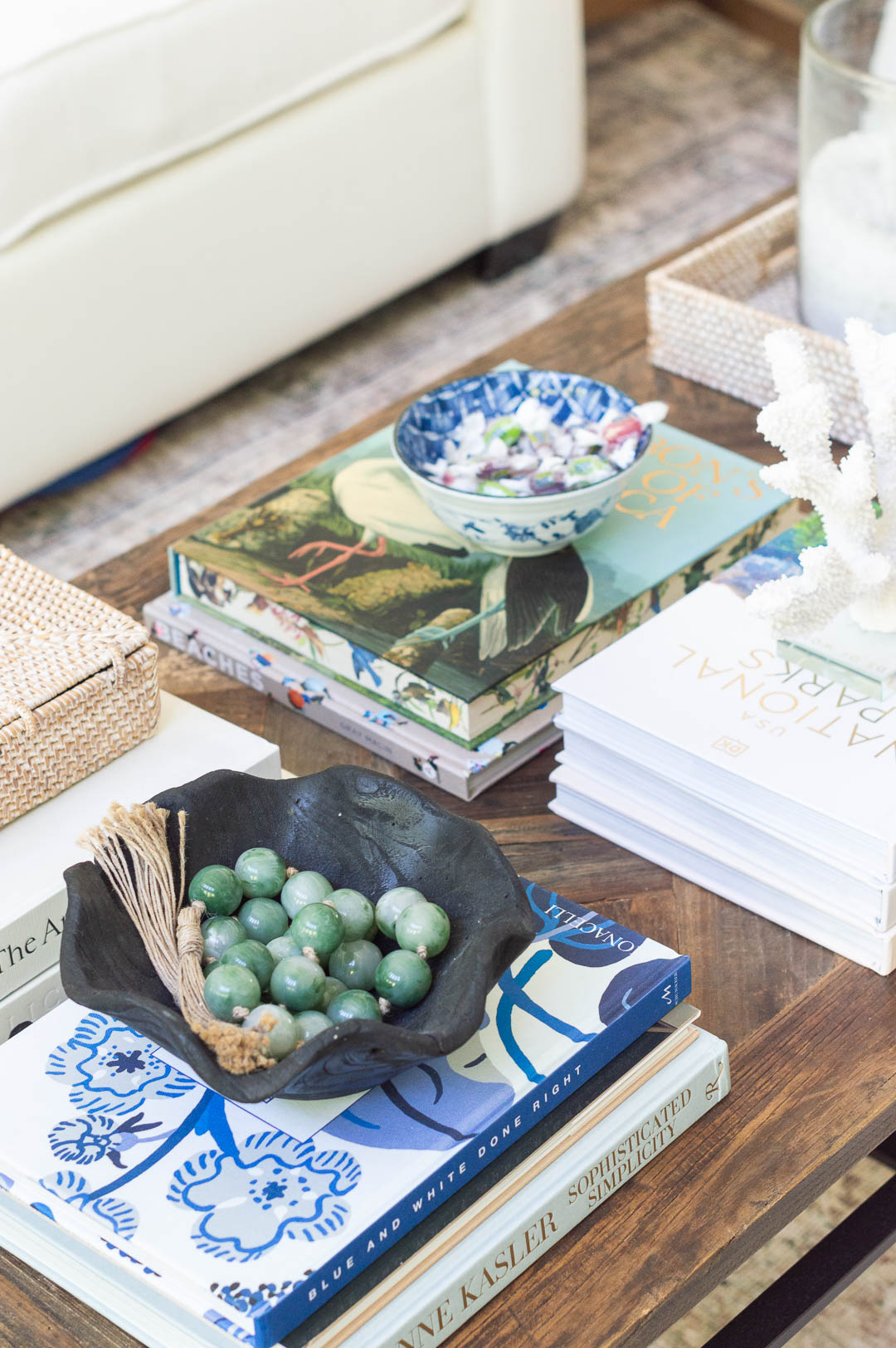 Vase | Rattan Tray | Coral (similar) | Black Teak Bowl | Jade Bead Garland (similar) | Blue & White Done Right | Sophisticated Simplicity | Audubon Bird Book