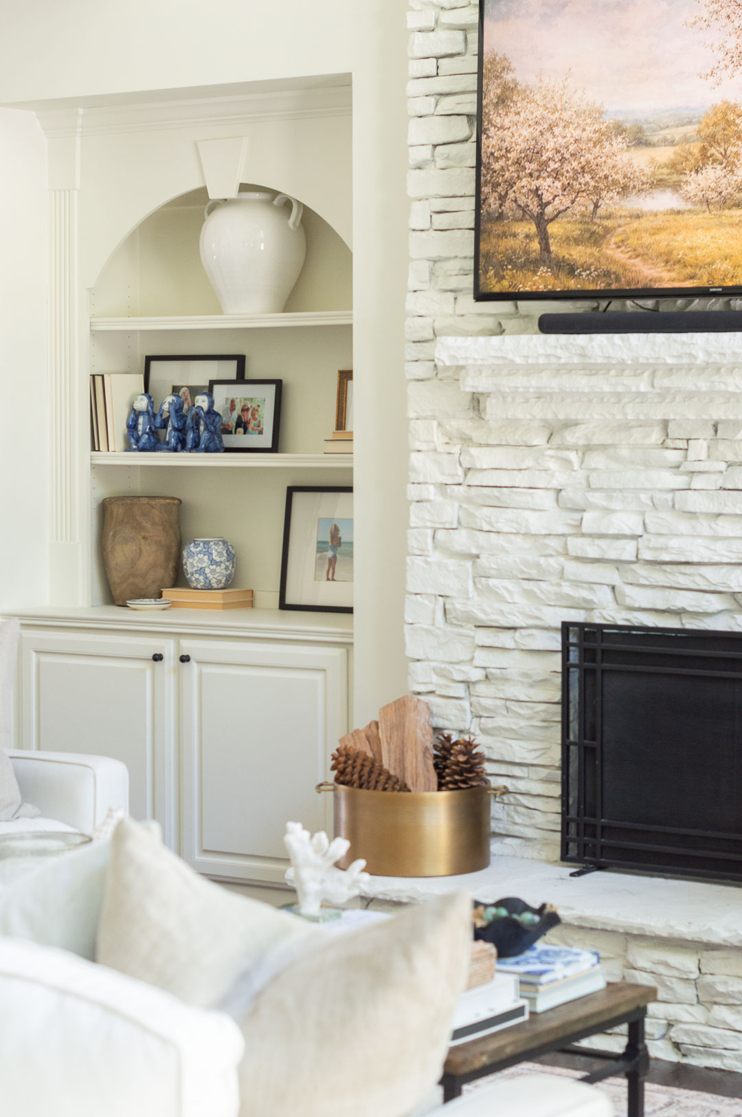 Among some of the things I’ve brought back out to mix in are small ginger jars, blue and white ceramic bowls, special and original blue and white (like you, bookshelf monkeys 😉 ), and subtle patterned pieces alongside neutrals. It adds a little more polish to some of the organic textures that I’m still loving, and makes the space feel a little more collected and a little less one-note.
