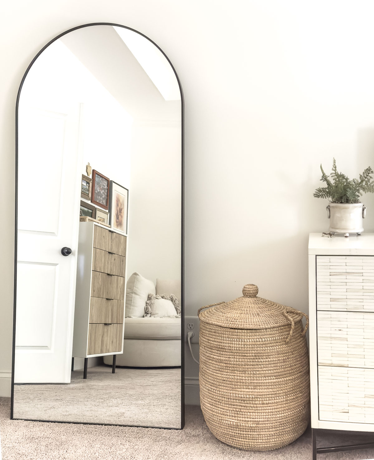 My mom recently ordered a new floor mirror from Wayfair for her bedroom and it is totally on trend and such an incredible value! There are multiple sizes and I love the arch shape — which, again, helps to break up some of the more severe straight lines and corners of her furniture.
