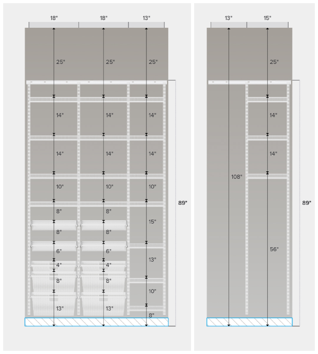 I took measurements, snapped photos, set an appointment, and went in to meet with the designer already having an idea of the layout and essential components I had in mind. Here are the two walls we came up with.