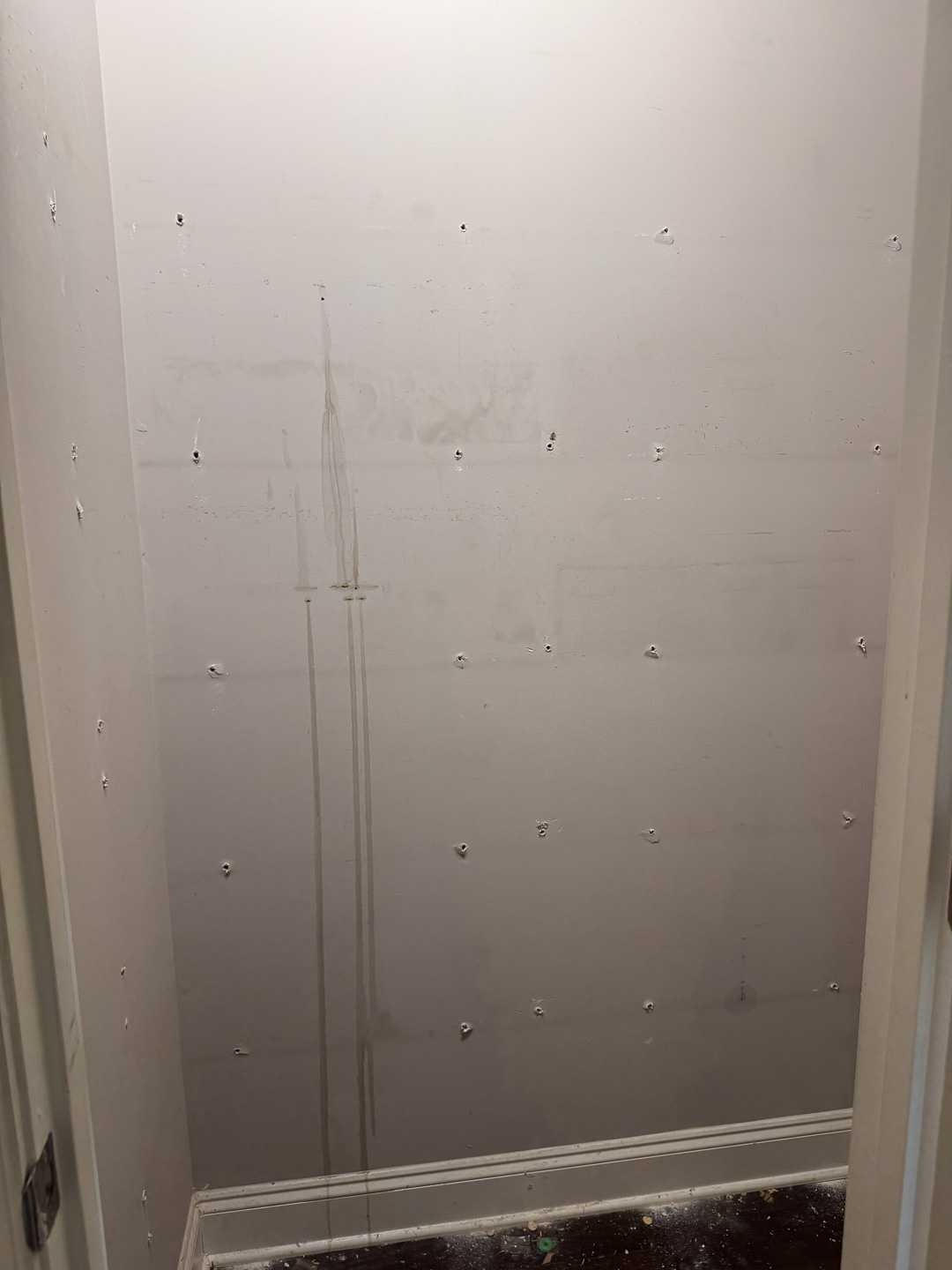 Before installing the new system, I took the opportunity to give the pantry a quick refresh. I removed all the shelves and hardware, patched holes, scrubbed walls, and painted everything bright white using supplies and paint I already had on hand in the basement. While our kitchen was painted years ago, our pantry was still the same greige we had at the start of 2015. By the way, you can see my original pantry organization project from back then HERE. Note the stains and evidence of a can that had leaked that we had no clue about…