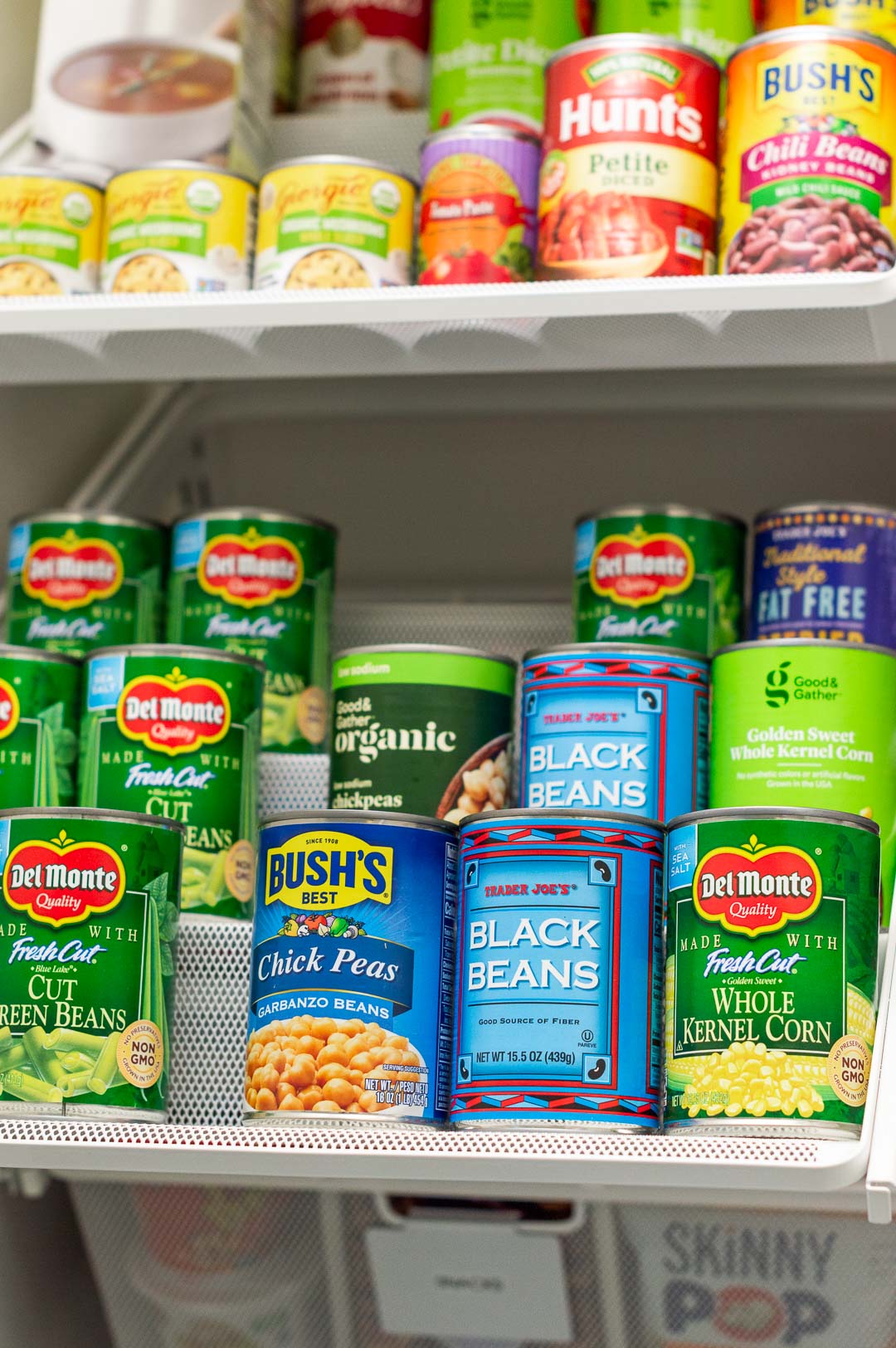 Instead of cans getting lost in the back of a shelf, everything is visible and easy to grab, which makes cooking and grocery restocking much simpler. If the can pull-outs aren’t an option for you, I still think THESE can risers we had previously are the next best thing. I am HIGHLY opposed to cans in bins/stacking cans in baskets.