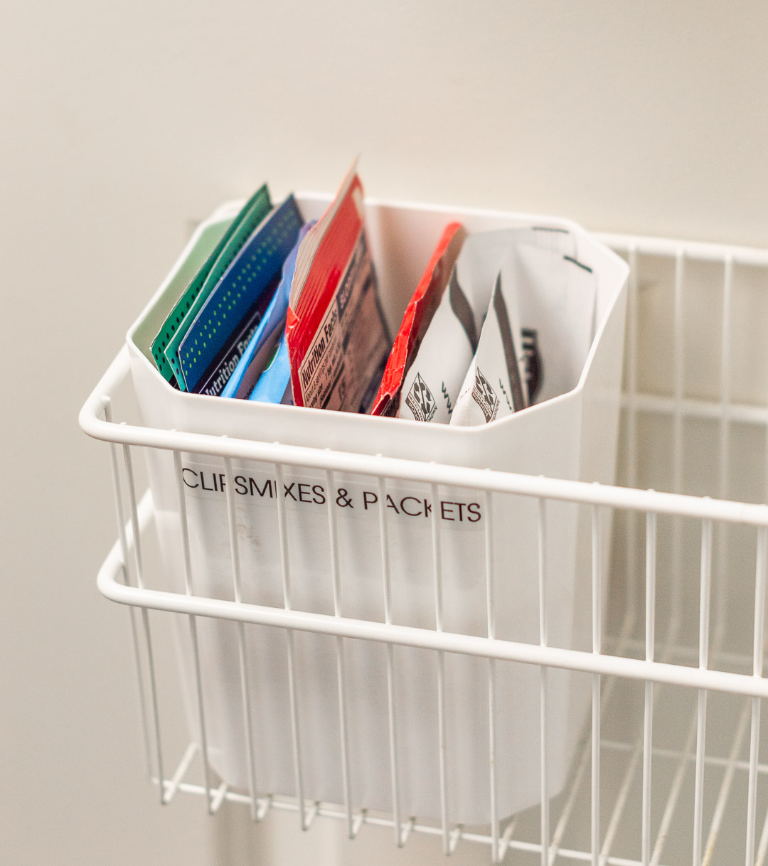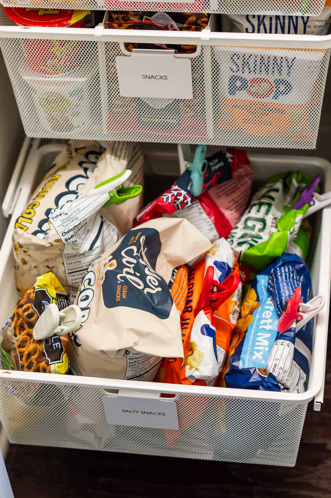 The deeper drawers in the bottom are used for bulk snacks. They even hold Costco-sized bags. While we keep back-stock of individual snacks that I restock weekly on a rack in the basement, my rule is to not outgrow the container I’ve allotted for a given category. We have plenty of big bags of snacks and until these thin out, I know I won’t be grabbing any more at the store.
