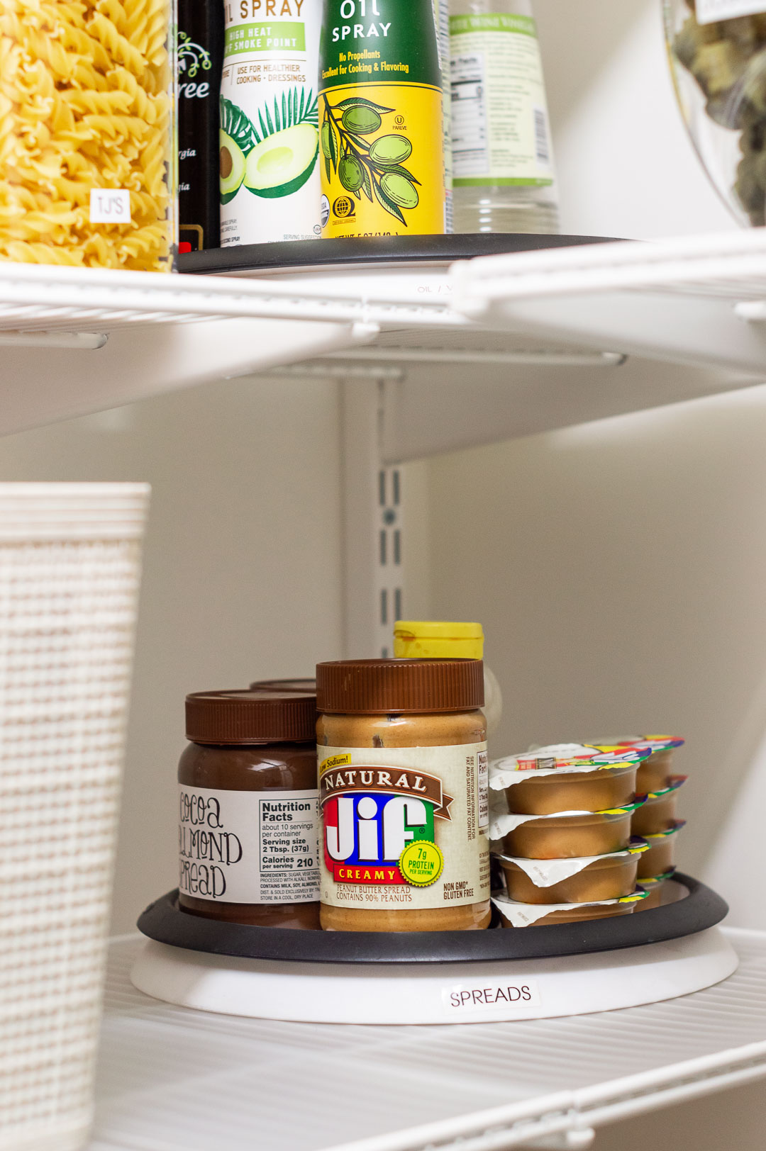 Corners can easily become dead space, so I added lazy Susans to hold spreads, jars, and condiments. If you have a corner anywhere — not just in the pantry — I 100% recommend a turntable so you can spin and access without digging.