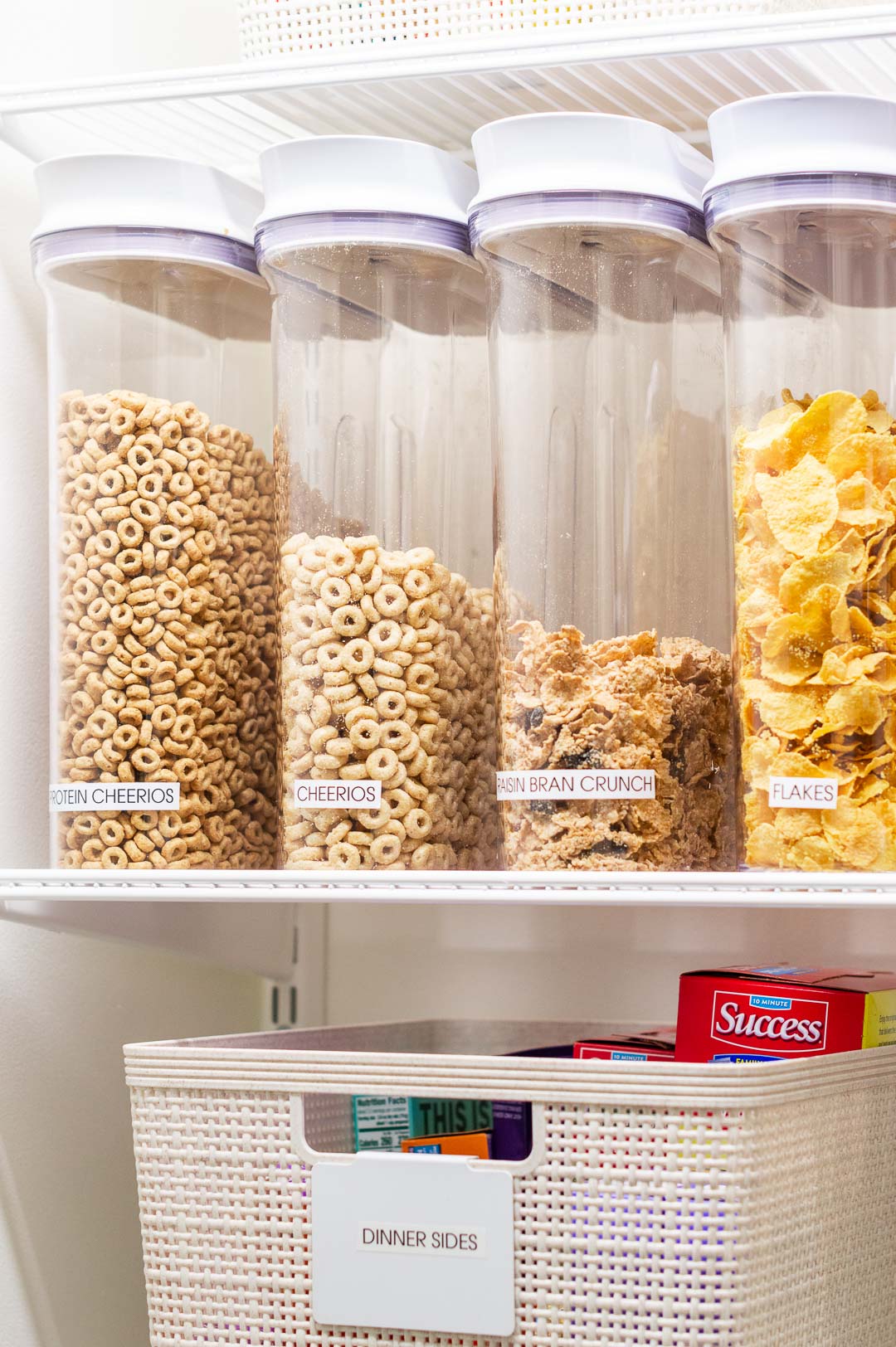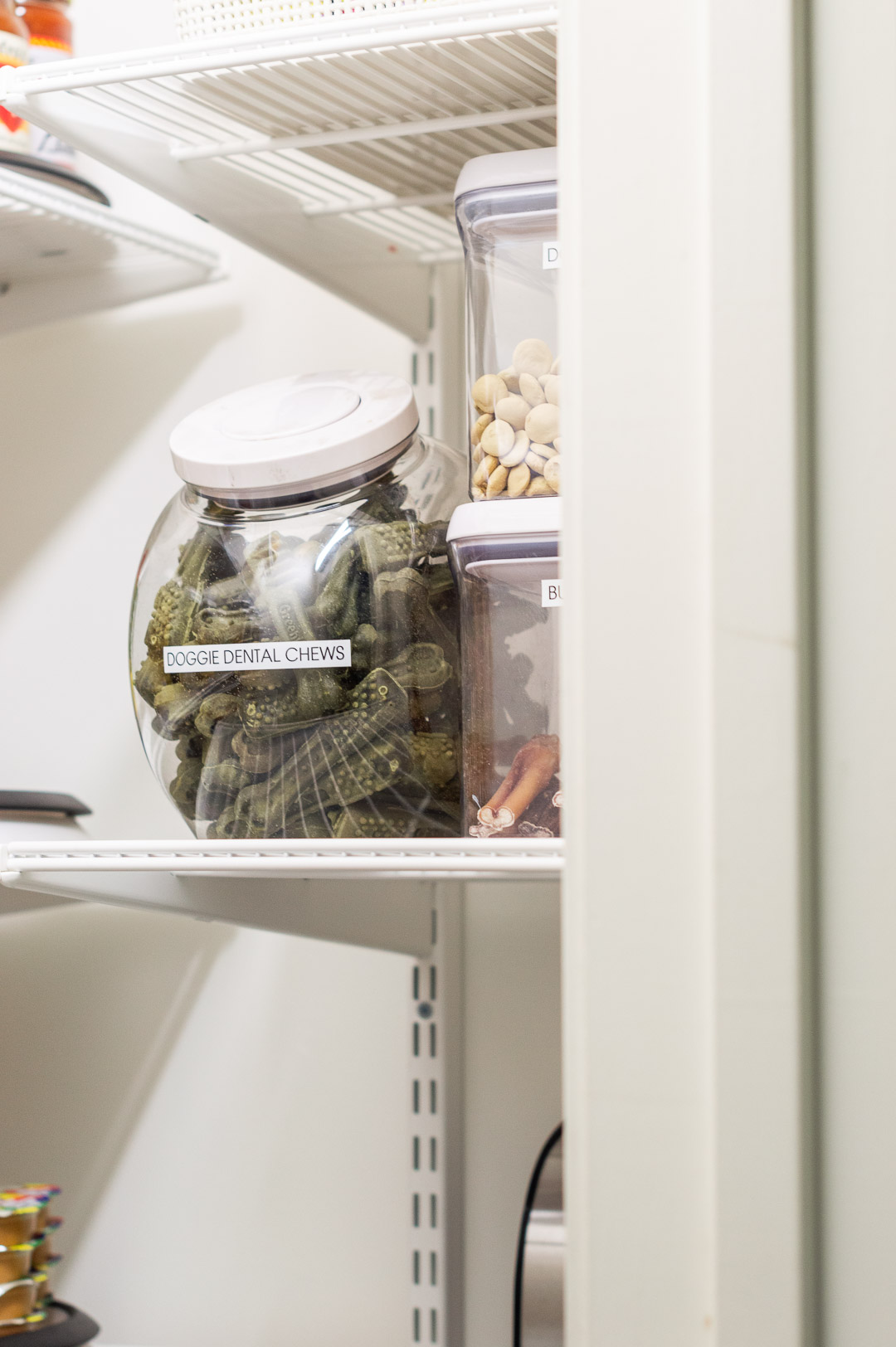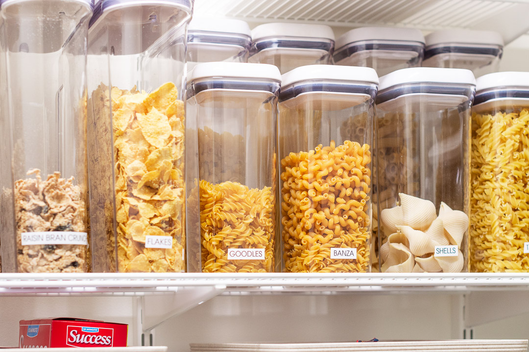 I’m not someone who believes every single pantry item needs to be decanted into a matching container. Although, I have come around to more items than I was once a proponent of. Instead, we focus on strategic decanting, only transferring items that really benefit from it. For us, that includes things like dog treats, pasta, and our always-stocked cereal