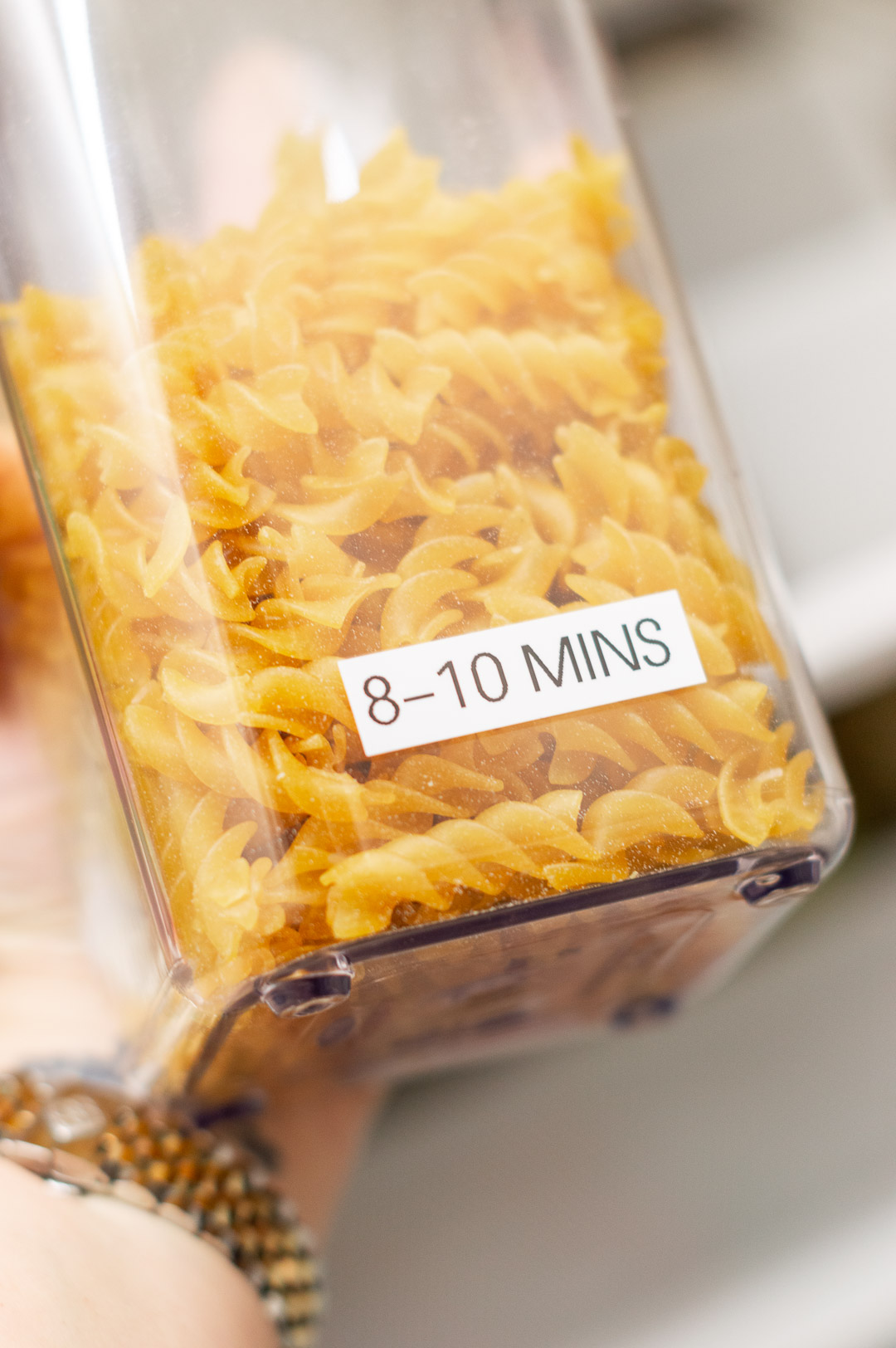 One small detail I love and recommend — I add the cooking times to the back of the pasta containers using my label maker.