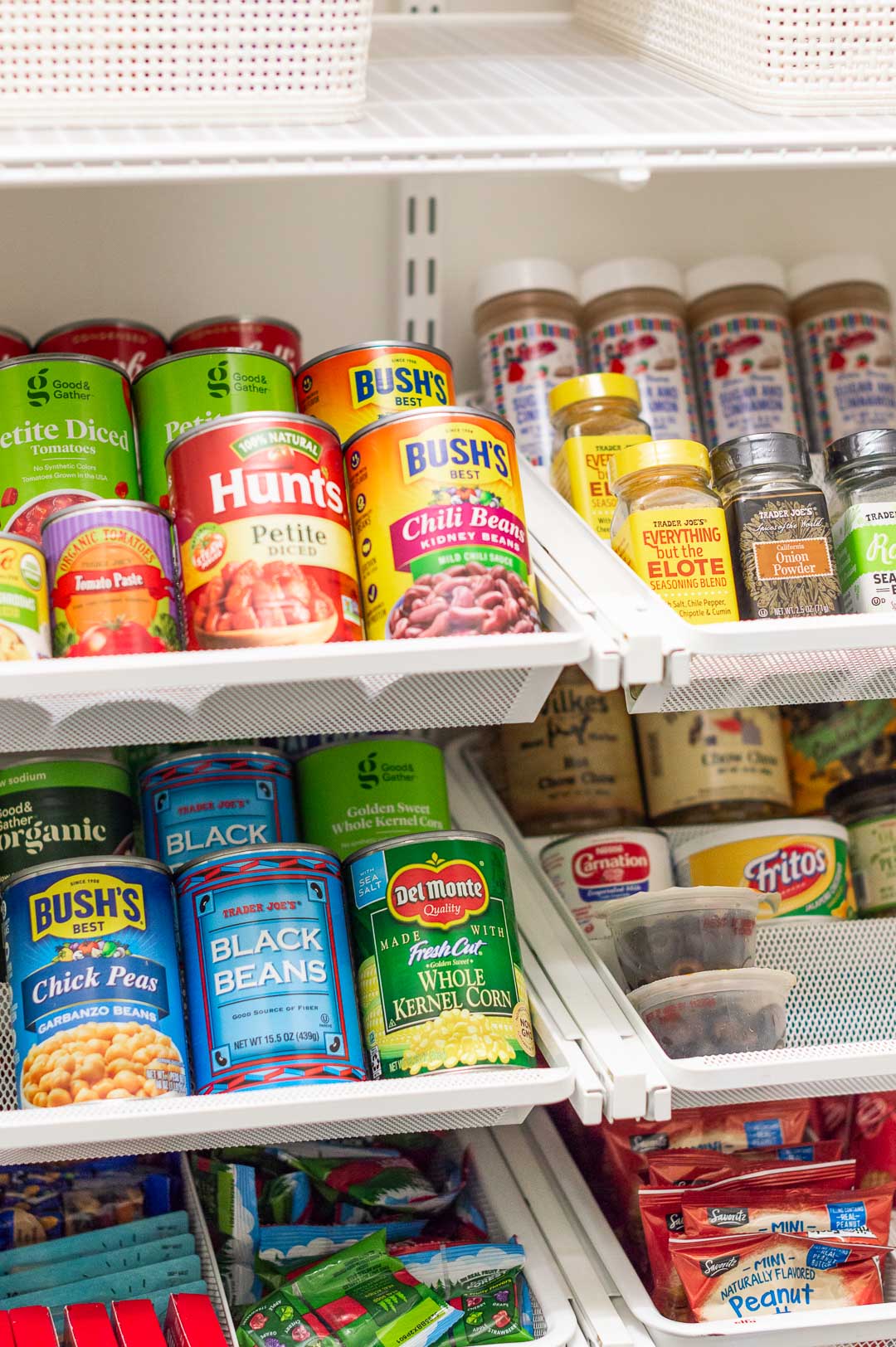 These pull-outs hold standard cans, jars, large cans, tiny cans, broth cartons, and even spice jars and canisters.