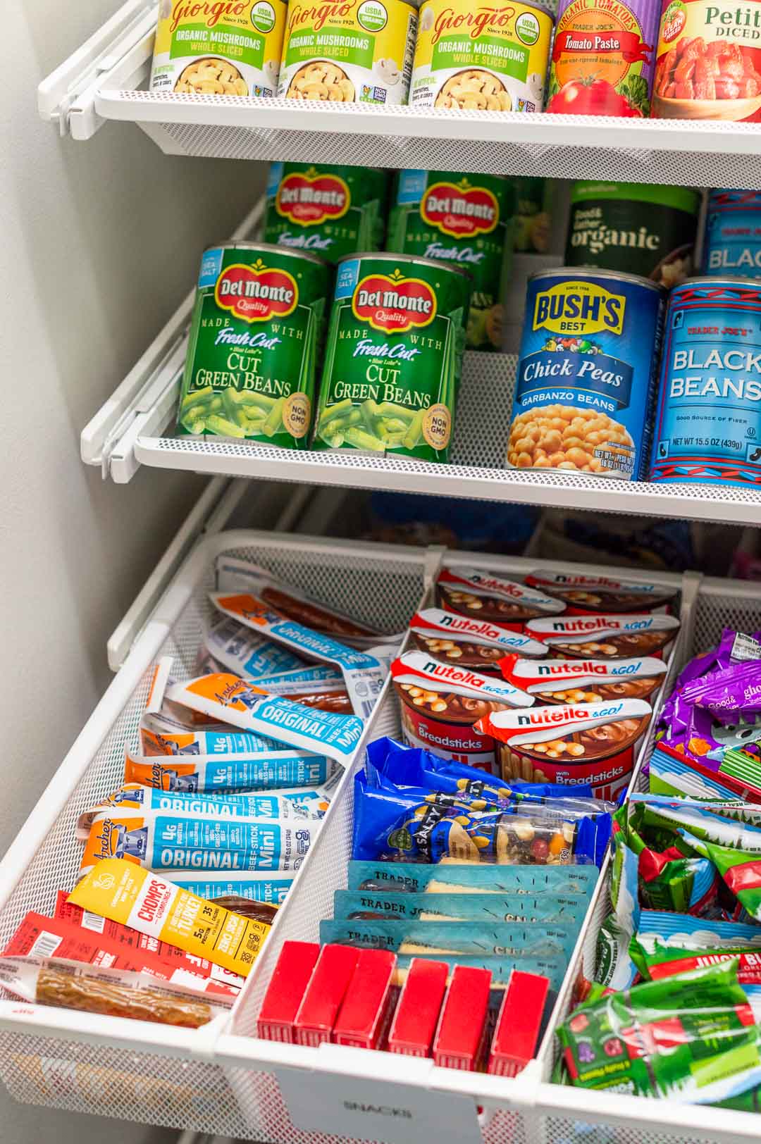 I’ve always loved drawers in a pantry, and these might be the most family-friendly upgrade of all. (As a matter of fact, drawers in lieu of bottom cabinets will be a necessity if/when we ever design a kitchen.) Not only do the snack drawers keep snacks organized, but they also allow my daughter to independently access her snacks, which is a win for everyone. I intentionally opted for some shallow drawers that I added dividers to for things like bars, fruit snacks, and meat sticks.