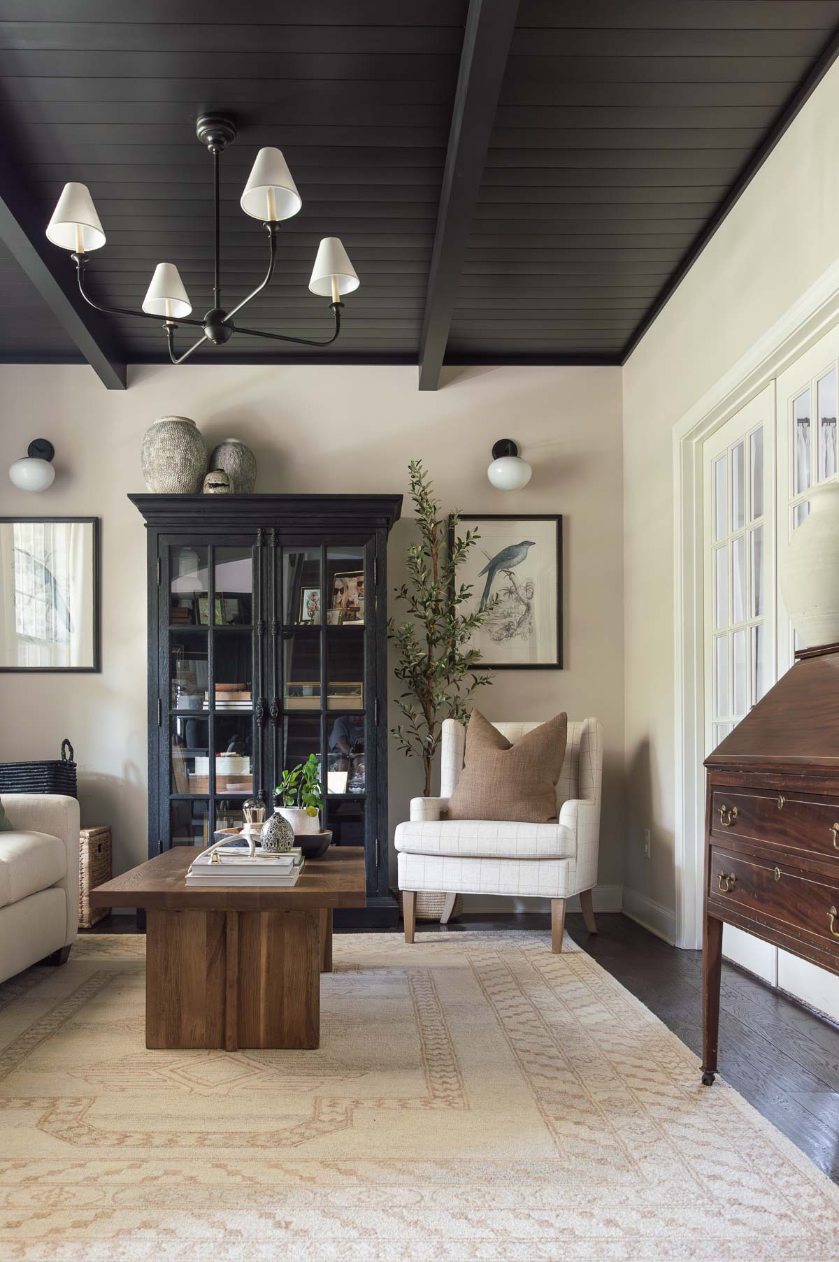 Chandelier | Area Rug | Windowpane Check Arm Chair | Belgian Linen Pillow | Faux Olive Tree | Bird Print Pair | Sconces (similar) | Stoneware Vase | Secretary Desk (similar)