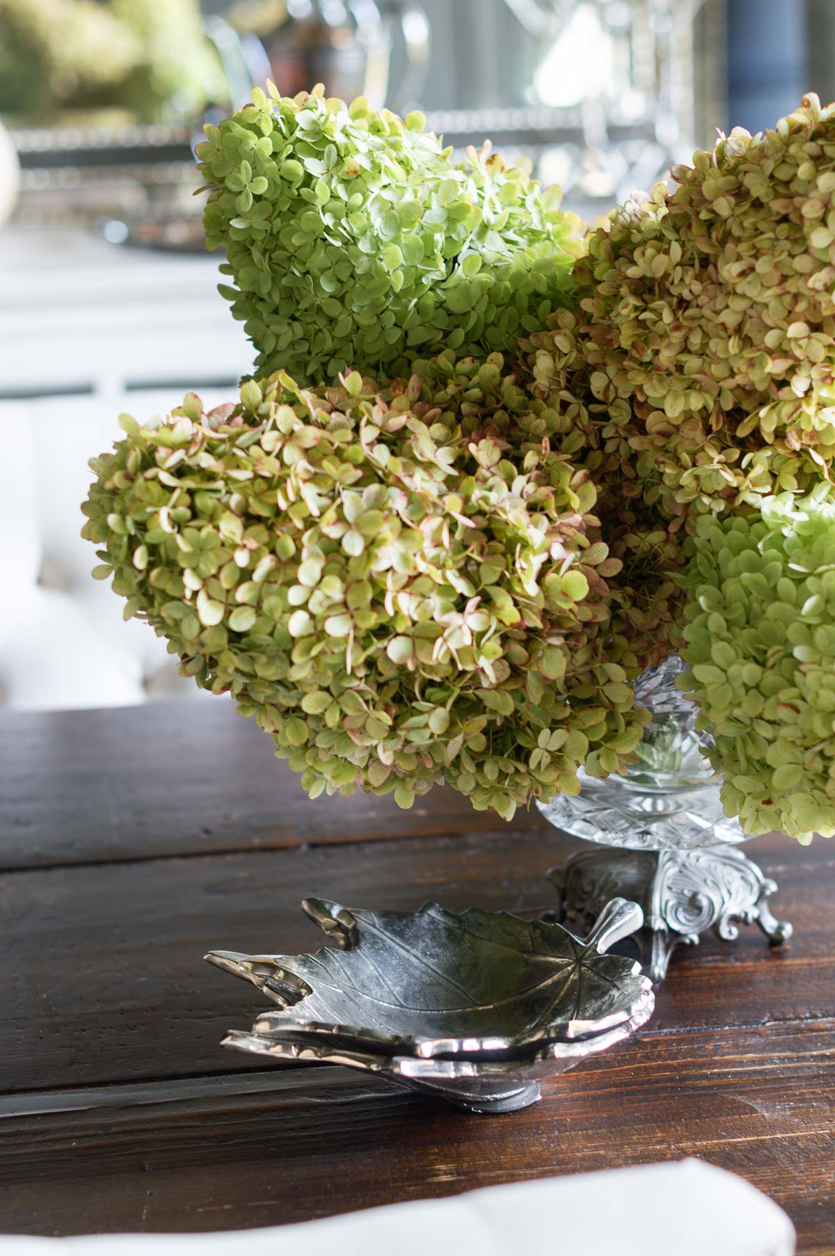 Since I moved the vibrant red maple leaf wreath outside, I brought up a longtime fave. I also have been cutting our limelights more often than I have in recent years.