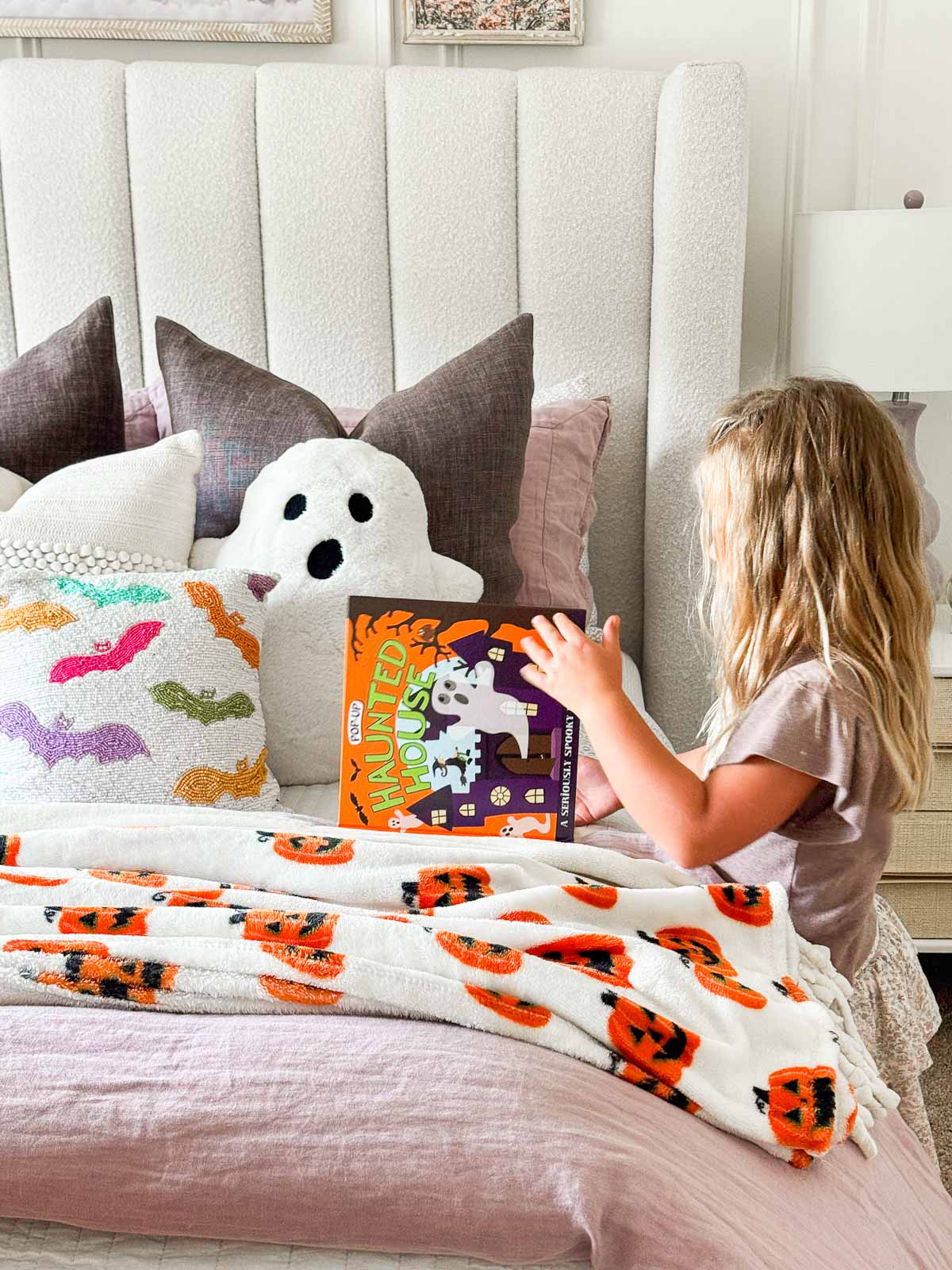 If you missed it on Instagram, you can see Eliza’s reaction to coming home to her bedroom updated with Halloween, and a boo basket at the foot of her bed HERE.