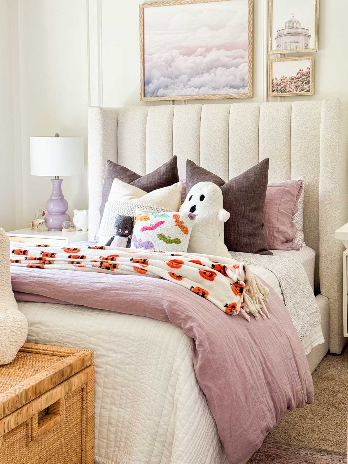 Bed (full, vertical tufted, tall, white chunky boucle fabric) | White Linen Quilt | Duvet Cover | Shams | Linen Throw Pillow Covers | Beaded Bat Pillow | Ghost Pillow (similar) | Stuffed Kitty Cat | Rattan Storage Trunk | Lamp (similar) | Piggy Bank | Cloudscape Art (print size is 30 x 24″ | Castle Art (print size is 11 x 14″) | Jacaranda Art (print size is 10 x 8″)
