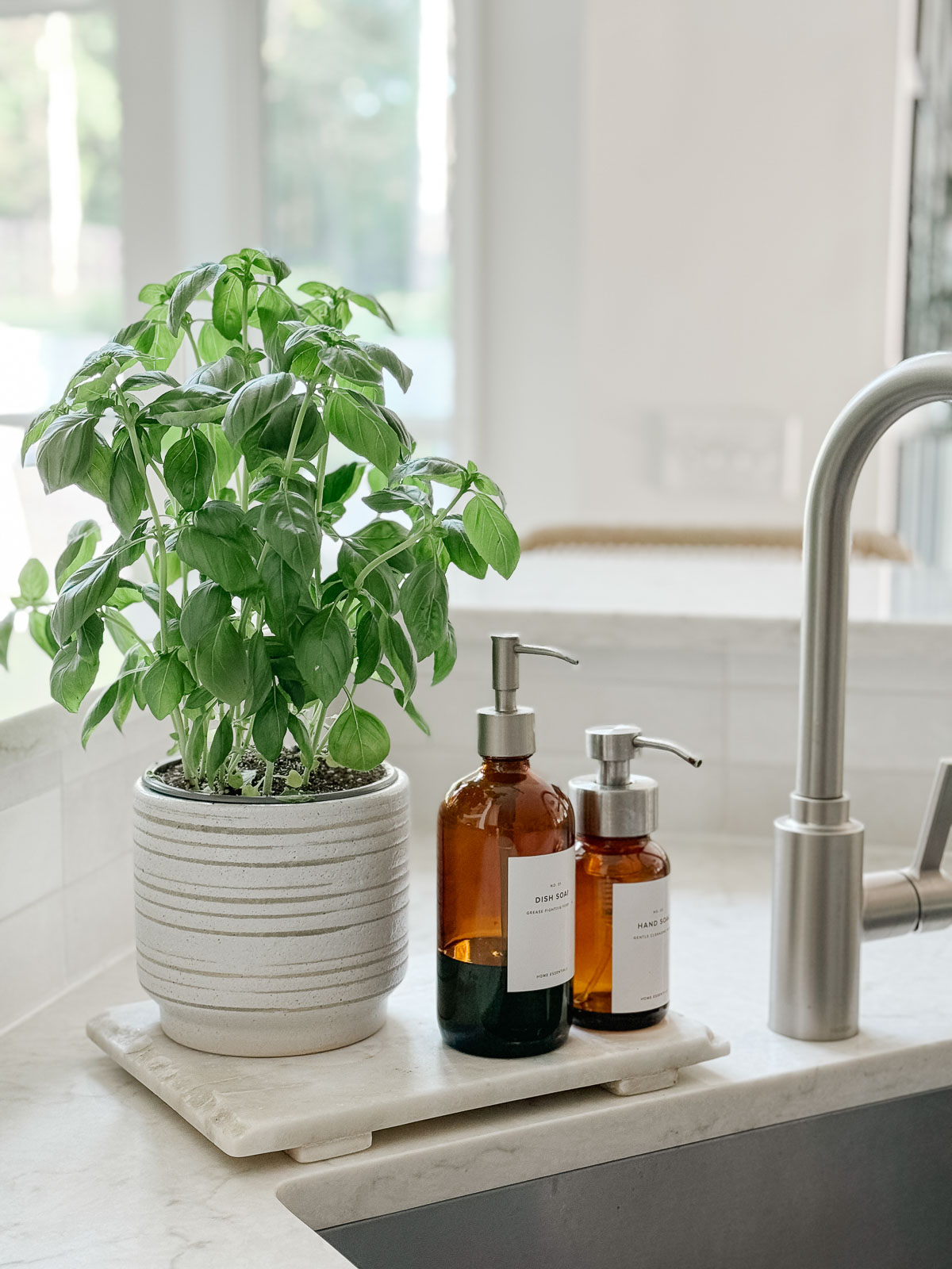 Sources: Plant Pot | Soap Dispenser Set | Marble Tray (similar) | Faucet
