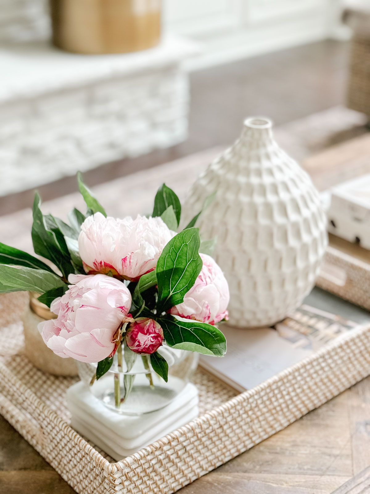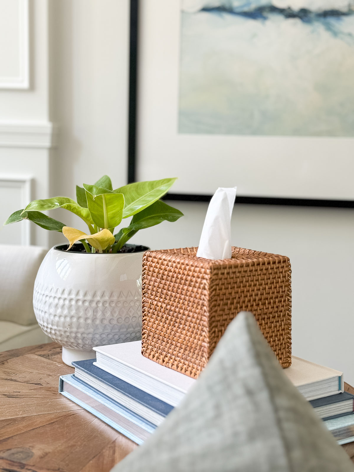 Sources: Match Cloche | Rattan Tissue Box Cover | Bud Vase | Rattan Tray | Bubble Planter | Tall Textured Vase