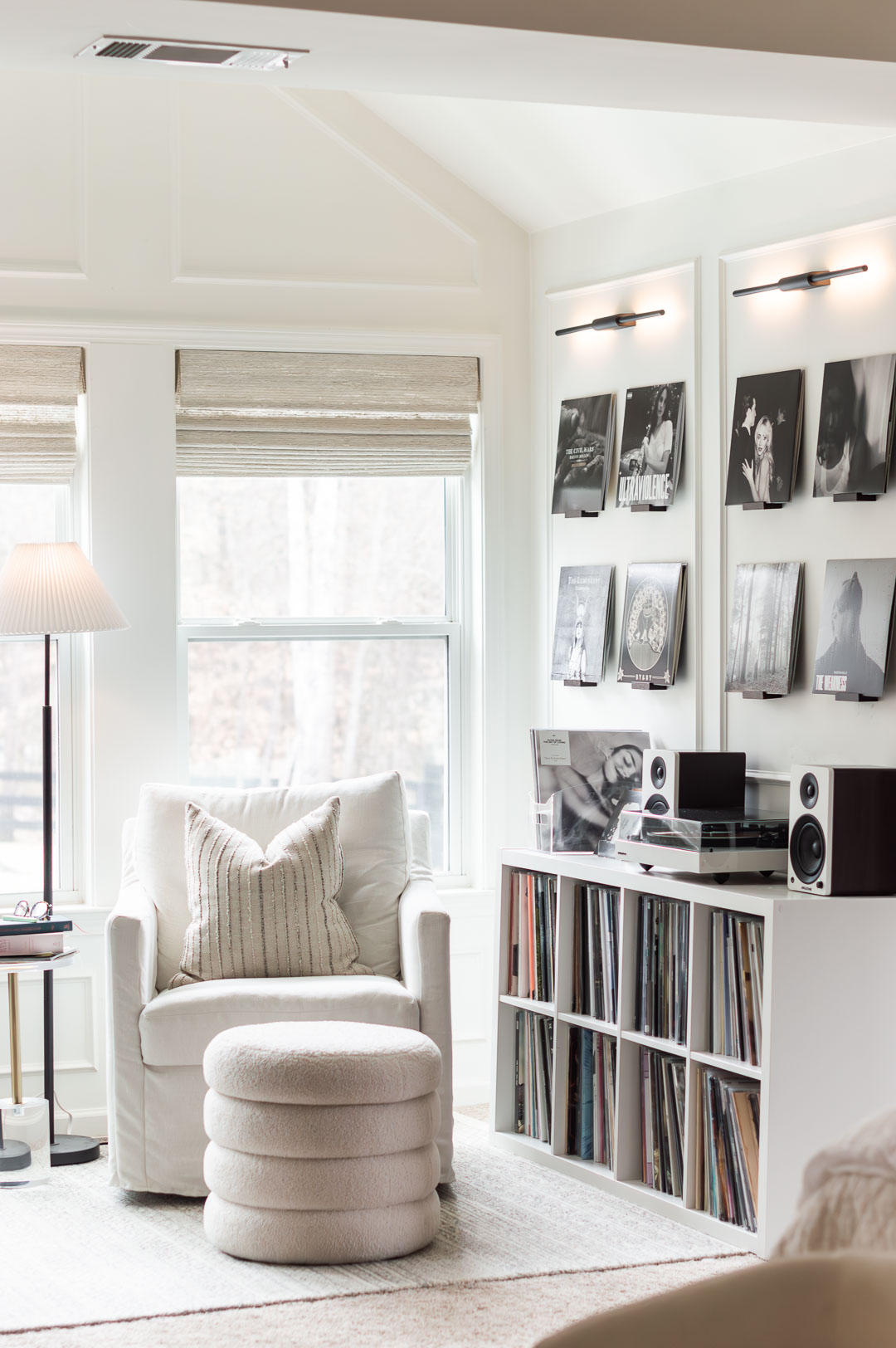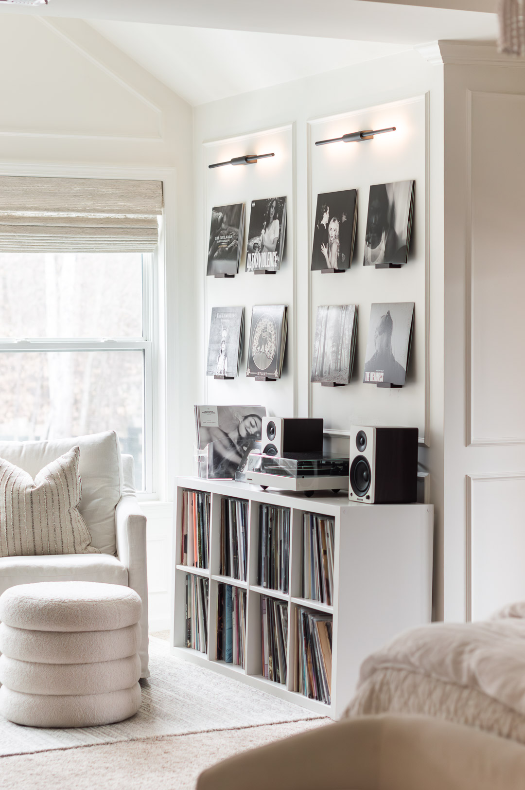 Rechargeable Sconces (Set of 2) | Floating Wooden Record Shelves | Record Storage Console | Record Player | Speakers | Acrylic Record Holder | Clear CD Holder (used for singles) | Floor Lamp | Window Shades (in Bali White) | Rug | Storage Ottoman | Pillow | Acrylic & Gold Pedestal Side Table